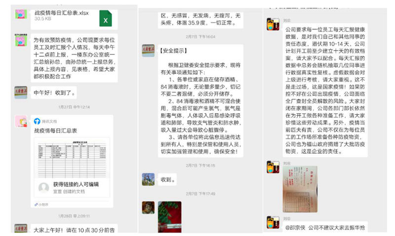 自疫情發(fā)酵伊始,公司迅速行動,防管理層迅速成立防疫工作組成立,各小組各司其職,積極籌備防疫物資,監(jiān)控員工健康動態(tài),做好防疫宣傳迅速,投入到防疫工作中。1月28日起,公司制訂每日健康打卡,跟蹤全體從業(yè)人員每日動態(tài),確認員工每天出行動態(tài)和健康狀況;并積極分享防疫工作的小知識,權威部門信息發(fā)布和防疫動態(tài)。